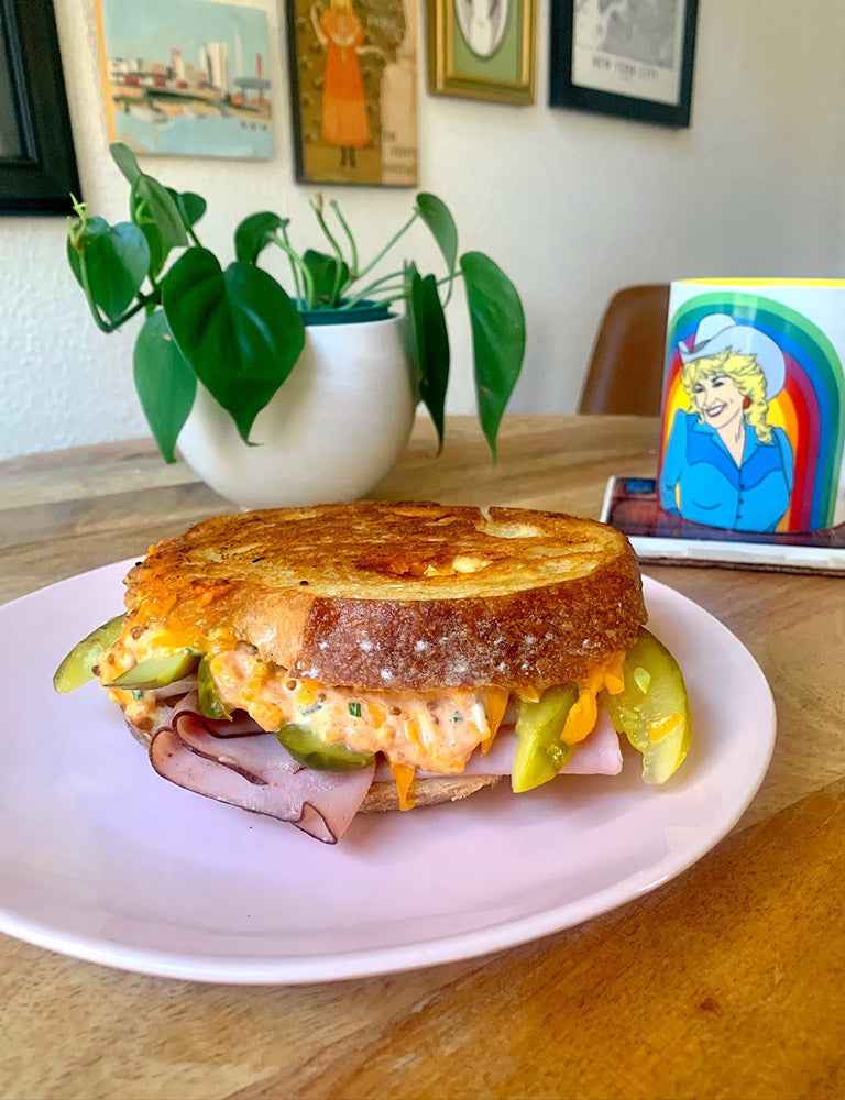 It’s very simple: On your favorite bread, add sliced ham, pickles, pimento cheese, and mustard. Cook it in a skillet with butter until brown on each side and thank me later.