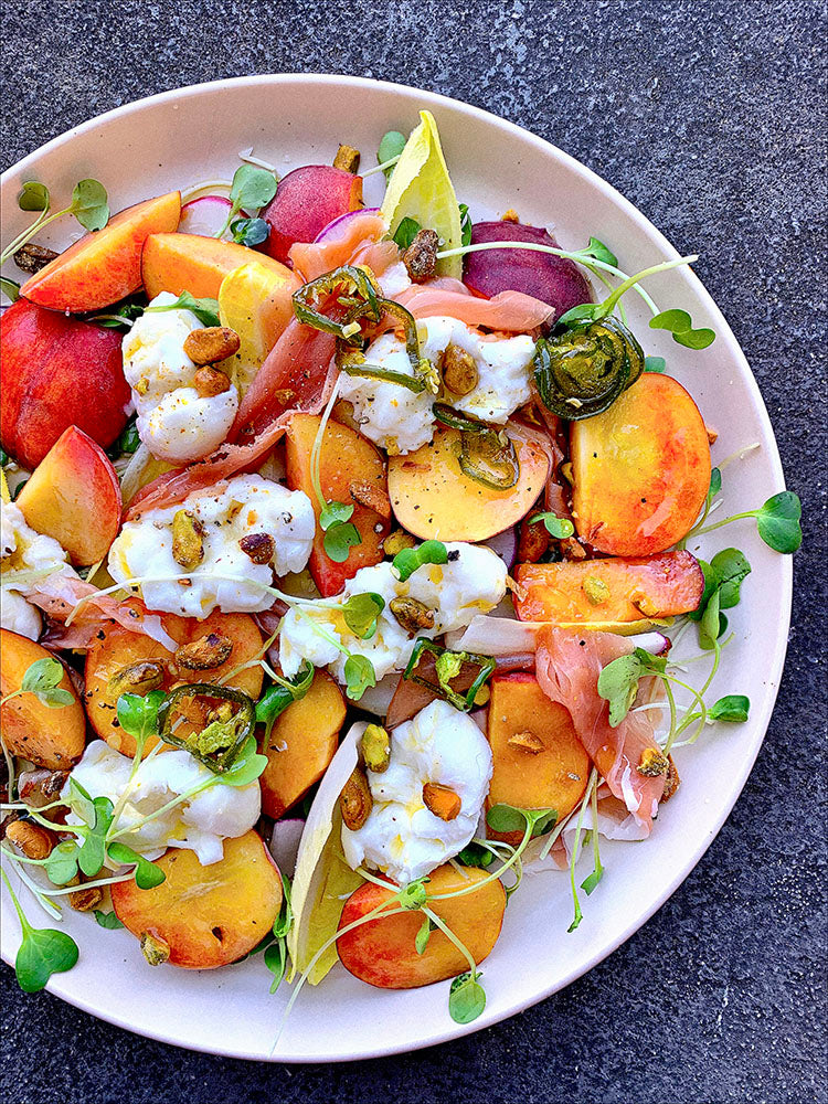 Combine the peaches, prosciutto, endive, and burrata cheese to the serving dish, and top with pistachios, olive oil, and hot honey when it’s time to eat. Don’t forget the candied jalapeños!