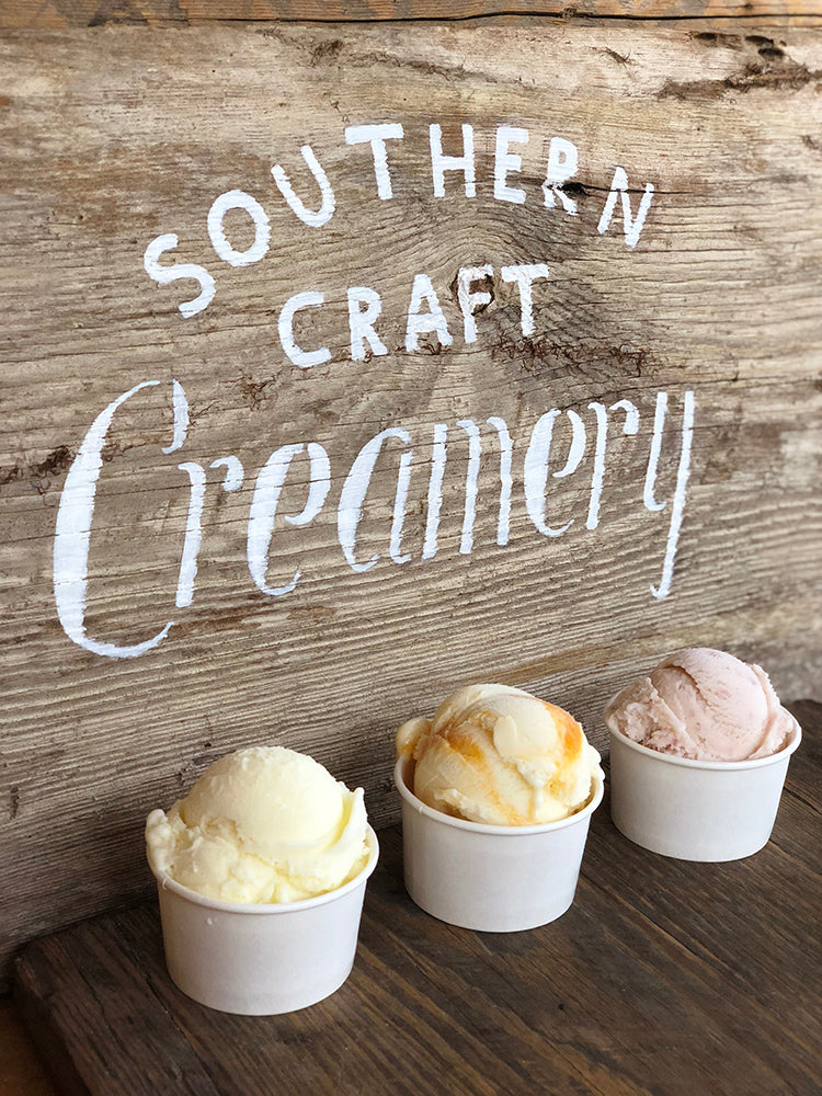 Ask Southern Craft Creamery owner Dale Eade which flavor of his handmade ice cream is his favorite, and he’s got a quip ready: “Whatever one I’m eating at the time,” he says. The self-described “coffee addict” is also a big fan of their coffee ice cream (incorporating locally roasted beans). But he’s yet to find fault with any of the more than eighty varieties of cold, creamy confections he and his wife create at the Creamery, which grew from their family dairy operation, Cindale Farms, and relies on its rich, creamline (non-homogenized) whole milk for its sweet cream base.